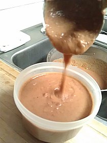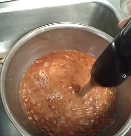 After a quick stir to make sure all the liquid is incorporated, the beans are done. Because it’s still hot, the beans should be rather fluid and pourable. As you can see from the last photo, there are still a few bean pieces visible…not unlike refried beans. Don’t worry that the mixture is so loose. As it cools, it will thicken to the consistency you often find in canned beans. Experience will help you fine-tune how much liquid to use before blending to get the final thickness you want.